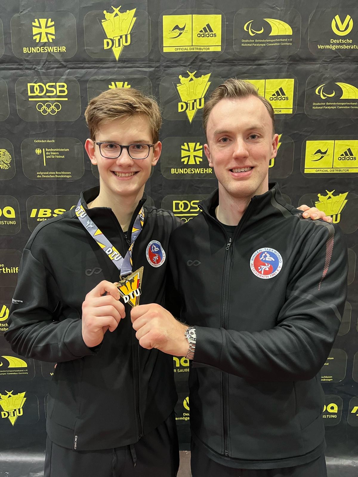 Vincent Koch freut sich zusammen mit seinem Trainer Lukas Winkler über den Sieg bei den Deutschen Meisterschaften im Taekwondo.