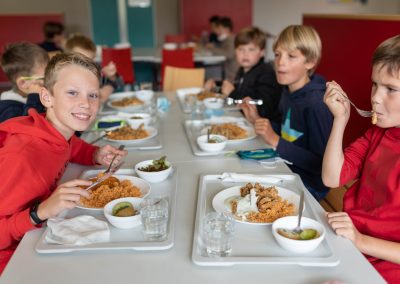 In der Mittagspause gibt es unser nach biologischen Grundsätzen und mit regionalen und saisonalen Produkten durch unseren Caterer gekochtes Mittagessen, das in allen Punkten die Voraussetzungen für eine gesunde Schulverpflegung erfüllt und auf Schweinefleisch verzichtet. Das Mittagessen für Individualesser muss zwei Tage im Voraus beim Mensateam bestellt und bar bezahlt werden.