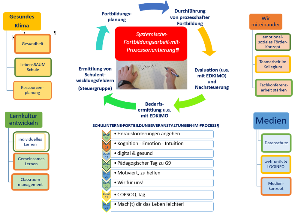 Schulinterne Fortbildung wird bei uns als Motor für Schulentwicklung verstanden. Ziel ist die systematische Weiterentwicklung der Kompetenzen aller Lehrkräfte. Hieraus resultiert die Gestaltung unserer Fortbildungsarbeit.